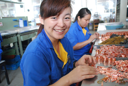 娴熟的技能、灵活的手法,二车间排片组刘娟的手指飞舞着,把一片片铜排片安插在小小的圆柱形塑料芯槽中,不一会儿一圈完成,再把厚度只有0.1-0.25mm的云母片插在每两个铜排片之间,这样一个换向器半成品在她的手指下便成型了。刘娟就像一个手指尖上的精灵,看似一个简单手工活,其中却蕴含了种种美丽境界。